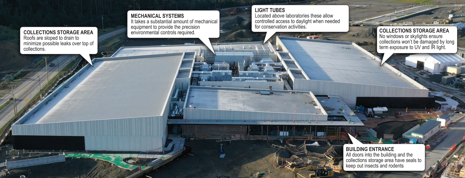 - Roof leaks – The building uses a high‑quality roofing system reviewed and guaranteed by the Roofing Contractors Association of BC but even with a high-quality installation, roof drains always create week points. The PARC building has been designed to remove this risk by sloping the roofs above the collections storage areas, directing the water away from the collections and draining it off to the side.