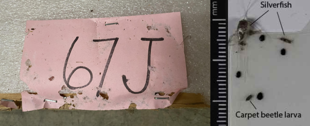 RIGHT: Silverfish and Carpet beetle larva caught in a sticky trap that conservators at the museum use to monitor how many bugs are getting into collections spaces.