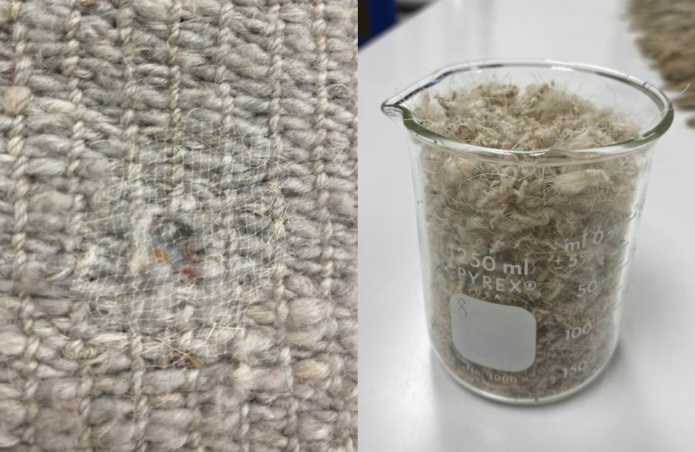 LEFT: This wool blanket shows damage caused by the common clothes moth (Tineola bisselliella). In their larva stage, these moths feed on animal‑based fibers like wool, alpaca, and rabbit fur because they contain the proteins the larvae need to build their cocoons. Since the eaten fibers can’t be replaced, museum conservators added a mesh patch to cover the hole. This helps stabilize the damaged area and keeps the sweater from unraveling.